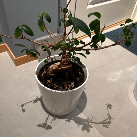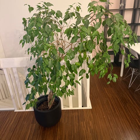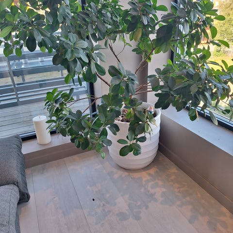 Ficus benjamina stueplante med grønne blader, plassert i en hvit potte. Potte følger med. Litt over 1 meter. Selges kun pgr. av at den er giftig for katten.