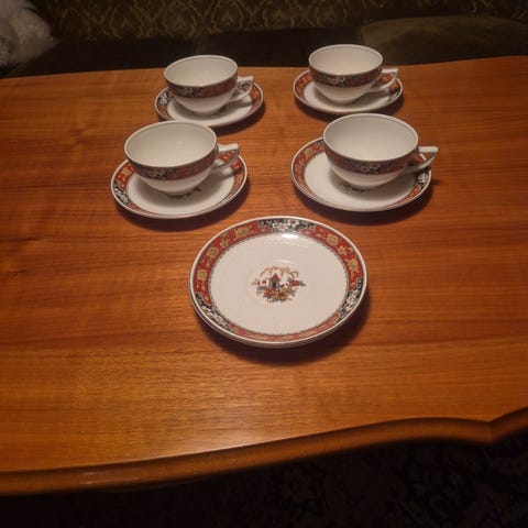 Kun en kopp med en sprekk i, se bilde. De andre koppene intakte og også asjetter. Håndmalt.