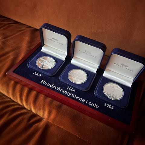 Selger min signatursett av kong Harald mynter, enkelte er av sølv og nysølv i tillegg til en 24 karat gull belagt mynt. Er godt dokumentert i heftet som har følger med hva de enkelte myntene er laget av.