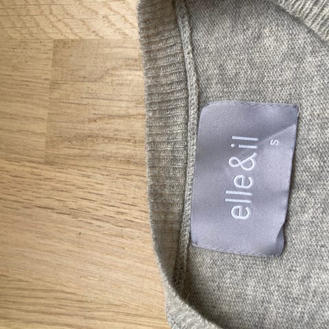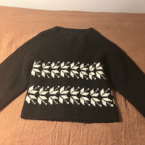Genser i hvit farge, laget av ullmateriale. Genseren har et strukturert strikkemønster og ribbestrikkede kanter på ermer og hals. Veldig god og varm