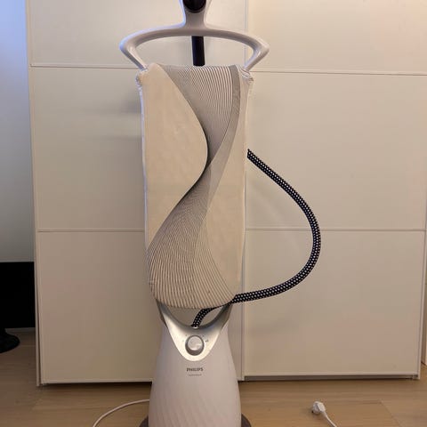 Philips dampstrykejern med stativ og integrert strykebrett. Selges som det er. Noe misfarging i bunnen av vanntanken, men går fint å fjerne med en bøyelig børste. Er til Oslo og Bergen med jevne mellomrom, så kan avtale henting der.