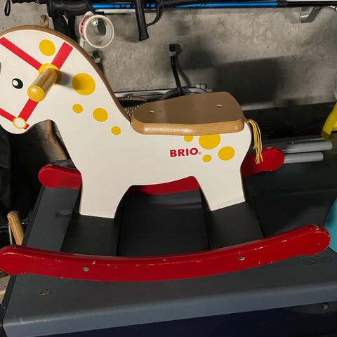 BRIO gyngehest laget i tre med rød og hvit farge. Produktet har et enkelt og klassisk design med sikkerhetsdetaljer for barn.