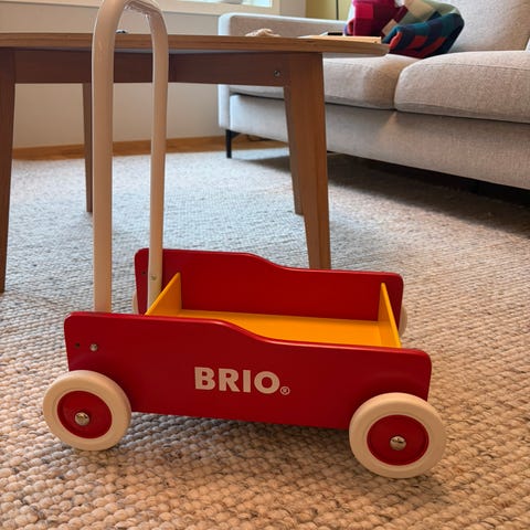 Lær å gå vogn Brio/ dukkevogn, stableklovn Brio og draleke hund på hjul Brio selges. Lekene har stått hos bestemor så veldig pent brukt. Se bilder.