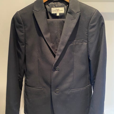 Mørk blå dress fra KappAhl til gutt i størrelse 152. Jakken har klassisk design med to knapper og er egnet for formelle anledninger. Kun brukt ved to anledninger. Hvit penskjorte i 152 følger med.