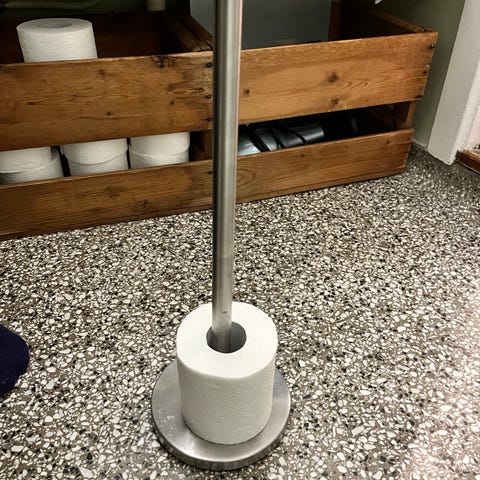 Frittstående holder for toalettbørste og -papir gis bort.