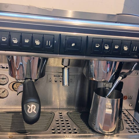 Expobar Megacrem 2 espresso maskin med dobbel gruppe, rustfritt stål og svart finish. Egnet for profesjonell bruk i kafeer og restauranter.