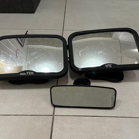 Speil til som festes enkelt på nakkestøtte i baksetet, slik at du ser på barn/baby som sitter/ligger "feil vendt" i bil. Veldig praktisk, så du har øyekontakt med barnet via midtspillet i bilen. Med fjernkontroll (og batterier) som du kan klipse innpå solskjermen / flappen.