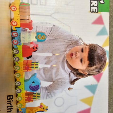 Tog i tre med bursdagspakke opp til 6 og plass til lys. Til å dekorere bord eller lignende.