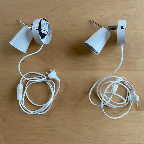 To lamper i hvit metall med ledning og bryter, egnet for veggmontering. Passer for lyspærer med E27 sokkel