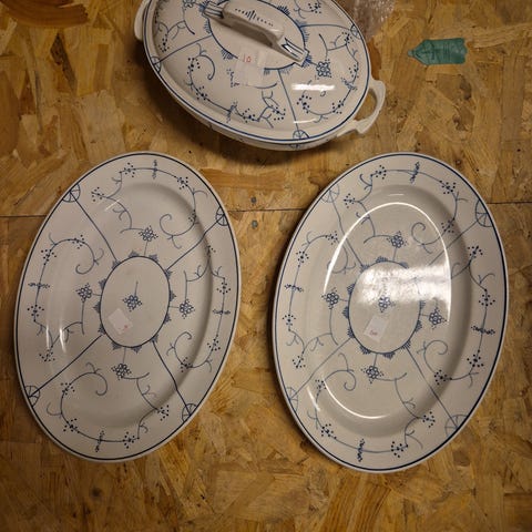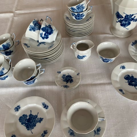 Royal Copenhagen Flora servise bestående av kopper og fat. Kopper med håndmalt blomstermotiv i ulike farger. Fat i matchende design. Materiale i porselen.