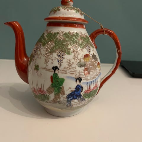 Vintage asiatisk liten mugge i porselen med dekorative motiver i flere farger, inkludert rødt, grønt og blått. Kannen har en rund form med håndtak og tut for enkel helling. Egnet for servering av væsker. Håndmalt.