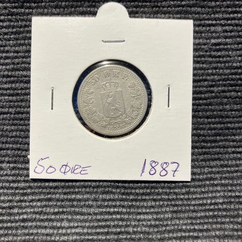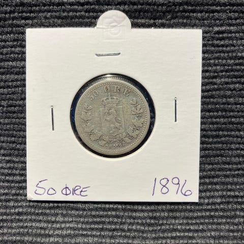Norges mynt 50 øre fra år 1893. Mynten har motiv av Norges riksvåpen på den ene siden og portrett av kong Oscar II på den andre siden.