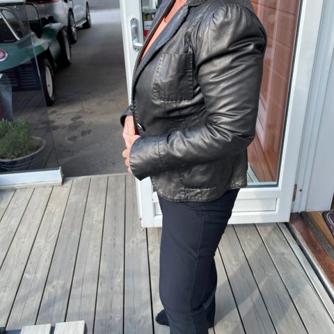 Svart skinnjakke med noen bruksmerker på innsiden, men selve skinnet/læret er i god tilstand.