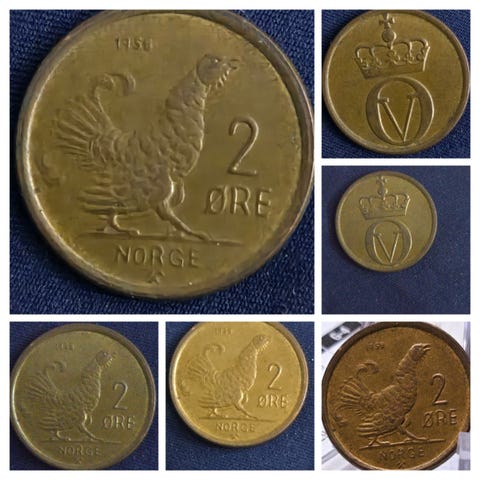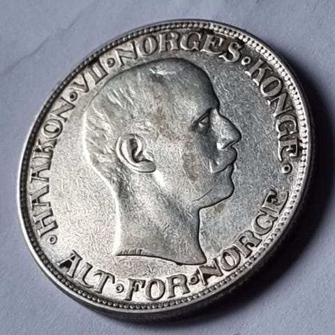 Norge 1 krone mynt fra 1954 med kongekrone og norsk riksvåpen på forsiden. Mynten er laget av metall og har tradisjonelt design brukt i Norge.
