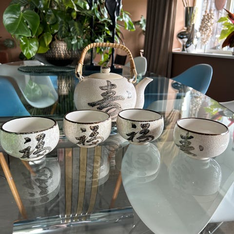 Vintage asiatisk porselen tekanne med håndmalt asiatisk motiv i farger. Tekannen har lokk og tut, og er dekorert med scener av mennesker og natur. Passer til servering av te. Håndmalt.