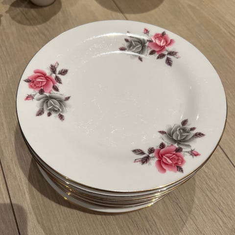 Pent servise, i perfekt stand. Bestående av kopp, skål og asjett samt sukker og fløtemugge. Omtrent ikke brukt. Kan deles opp i 6 x 2. Sender gjerne.