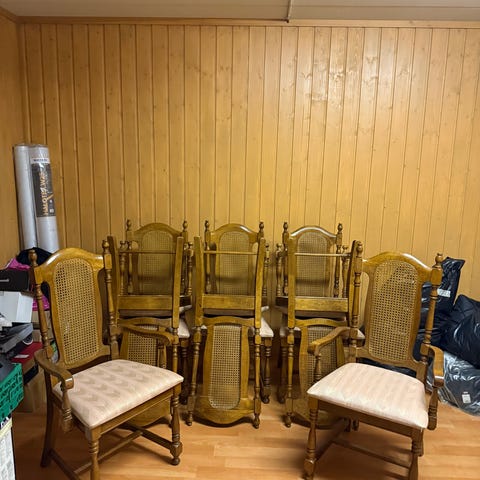 Selger 2 stoler som behøver litt oppussing. Stolene er uten store skader, kun slitte. Litt maling og oppussing så blir de fine igjen. De broderte trekkene er uten flekker og merker. Stolene har forskjellig design/dekor, se bilder.