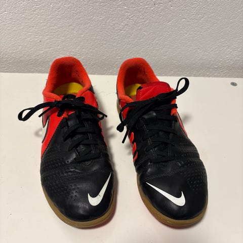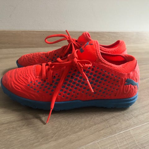 Fotballsko størrelse 39. Skoene har ulik farge på venstre og høyre sko, med rød snøring på venstre og blå snøring på høyre. Sålemønsteret er tilpasset fotballspill.