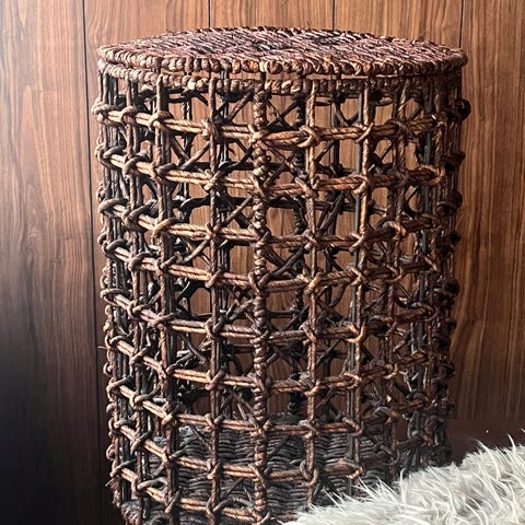 Rustikk kurv i mørk flettet materiale (muligens bambus). Solid og romslig, med praktiske håndtak. Kun brukt til oppbevaring av pledd og puter. Noen få skraper/bruksmerker forekommer, men dette gir bare ekstra sjarm og understreker den rustikke stilen. Fin både til oppbevaring og som dekor. Se bilder for mål.