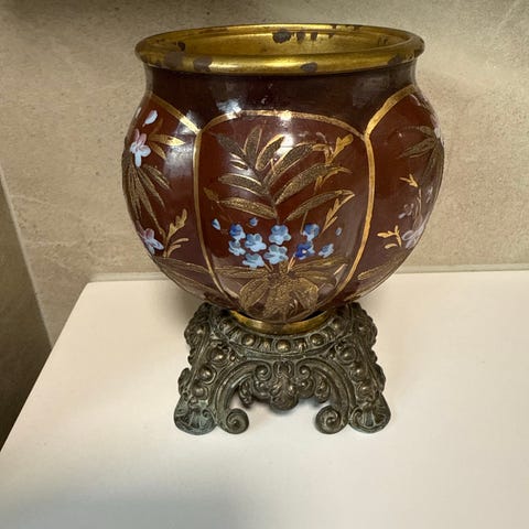 Antikk, vakker blomsterpotte, Grønn "flettet" med gule + rødfargede stemorsblomster, oppe rundt bølgekanten. 15,2 cm høy og dia åpning 16 cm. Har 2 små ubetydelige nag i glassuren nede ved foten - se bilde.