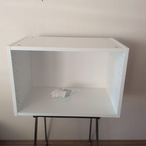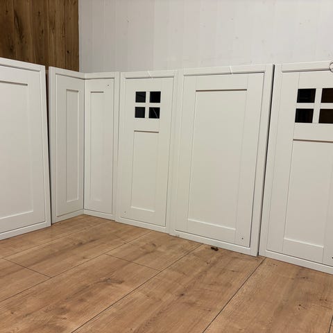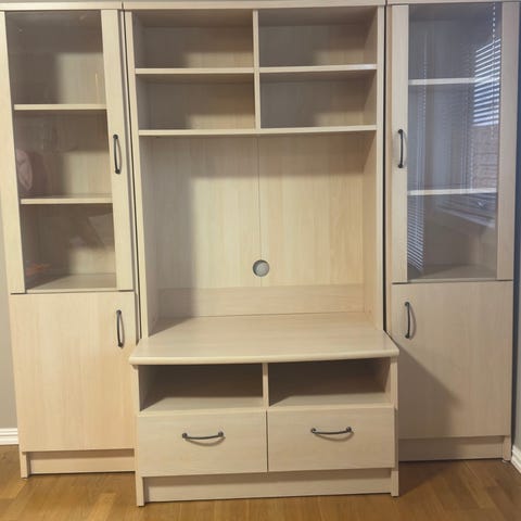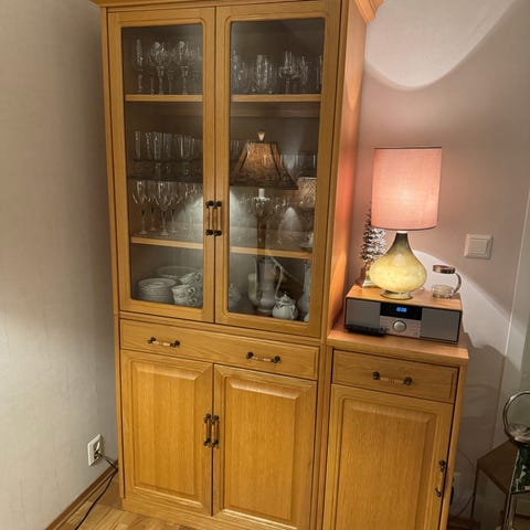 To stk skap med glassdører, en løs hylle i midten. Hvert skap er 79 cm bredt. Hyllen er 20 cm bred.