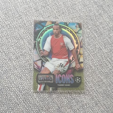Topps Thierry Henry fotballkort med bilde av spilleren i Arsenal-drakt. Kortet viser statistikk og karriereinformasjon for Thierry Henry, inkludert fødselsdato, posisjon (forward), høyde (1,88 m), vekt (83 kg), og prestasjoner i Premier League og FA-cupen.