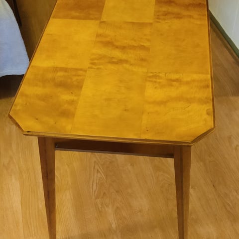 Selve bordet er i god stand, men det mangler noen få biter av mønsteret nederst på det ene benet. Disse følger med og kan limes på igjen ved behov. Bordet selges derfor billig.