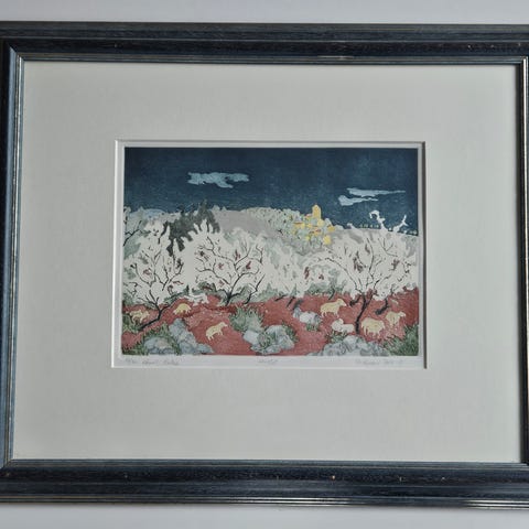 Selger et kunstverk av Ellen Hegg inklusive treramme.
