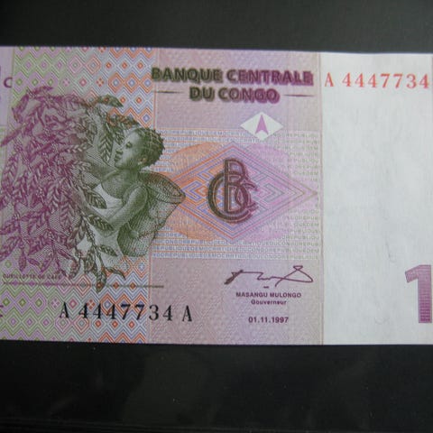Banque Centrale du Congo sedler med motiv av elefant, kraftledning og vannkraftverk. Sedlene har serienummer og dato 04.01.2022. Papirpenger fra Den sentrale banken i Kongo.