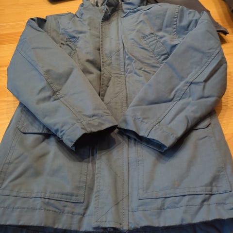 F399. str. 116 RETRO Anorakk m/hette og glidelåslomme (blå) Barn tex. Godt brukt, ingen skader, men hadde en gang en pelskrage, som har blitt borte. 100kr