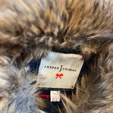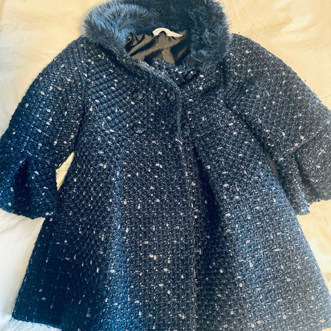 Nydelig marineblå kåpe i feminint snitt fra Jasper Conran Junior, størrelse 3-6 måneder. Hvitt, mykt fleecefôr på innsiden. Puffermer og knapper foran. Kun brukt en gang og godt tatt vare på.