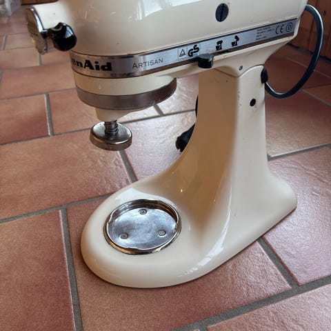 Selger min pålitelige KitchenAid Artisan 5KSM150 kjøkkenmaskin i den tidløse og elegante fargen Almond Cream (lys beige/krem) – en ekte klassiker!