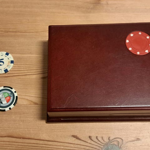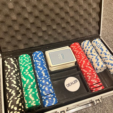 Pokerchipsett med flere fargede pokerbrikker og to kortstokker, levert i en solid aluminium koffert med lås og håndtak.
