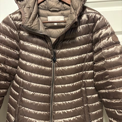 Som ny! Feminin lettvekts dunjakke med smale skrå tuneller, hette og feminin passform. Dunjakken har vertikale glidelåslommer, logo på glidelås og myk elastisk tape rundt hetten.