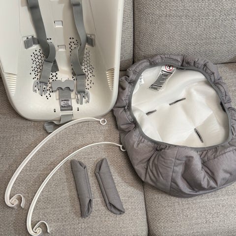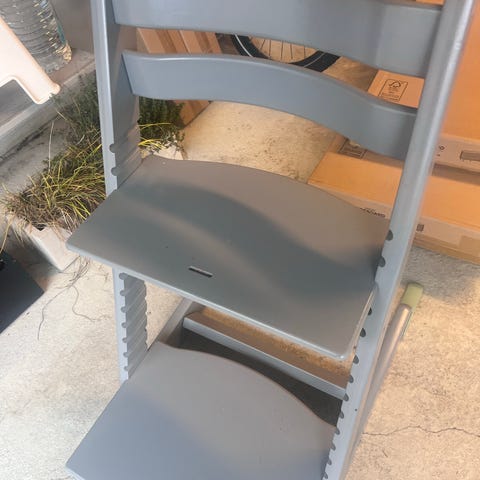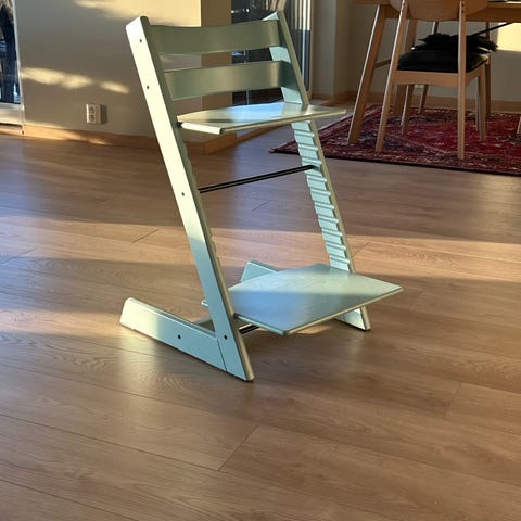 Stokke Høy barnestol laget i tre. Designet for barn med justerbar sitte- og fotplate. Passer til bruk ved spisebord for barn i ulike aldre.