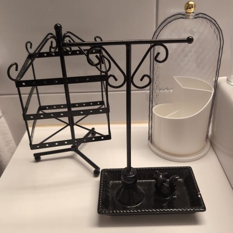 Smykkeskap med hvit farge og speil på døren. Inneholder flere kroker for oppheng av smykker, ringer og armbånd, samt rom til organisering. Designet for oppbevaring av ulike typer smykker på en ryddig måte. Kjøpt fra Clas Ohlson