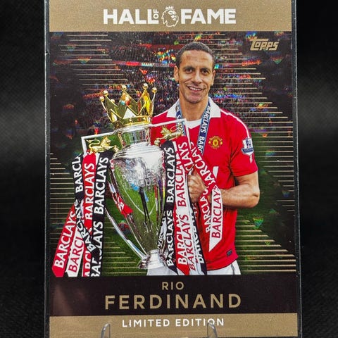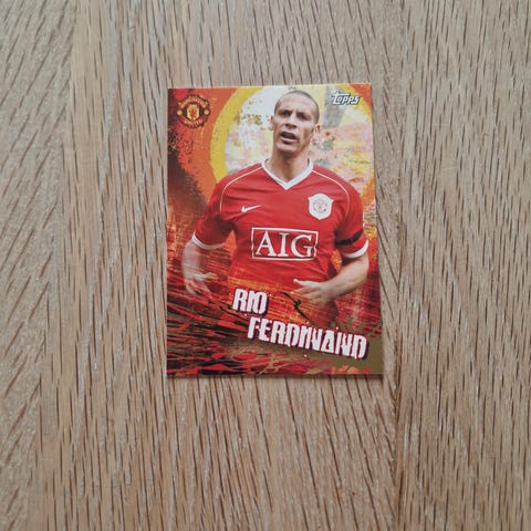 Topps Rio Ferdinand fotballkort med bilde av Rio Ferdinand i Manchester United-drakt. Kortet viser Ferdinand som forsvarer, med detaljer som fødselsdato 7. november 1978, høyde 1,88 m, og nasjonalitet engelsk. Kortet inkluderer statistikk fra Premier League 2001/2002 og 2002/2003 sesongene, samt informasjon om hans karriere og ferdigheter.