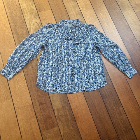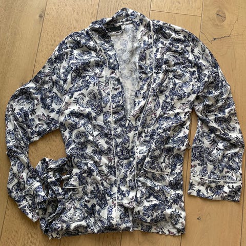 Herlig jakke i nydelig blåfarge med print fra Missmaya. Str XS/S, oppleves som en S. Belte i livet.
