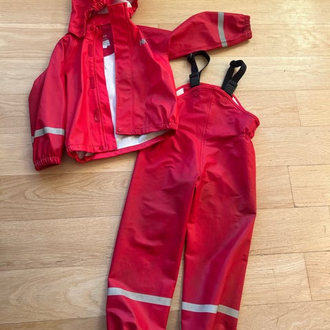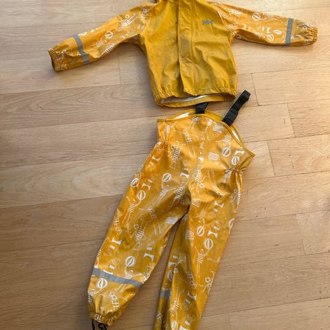 Selger et fint regnsett fra Helly Hansen str 5 år /110. Normal slitasje, bruksmerker kan forekomme. Jeg finner ingen hull. Jeg sender hvis du betaler for frakt.