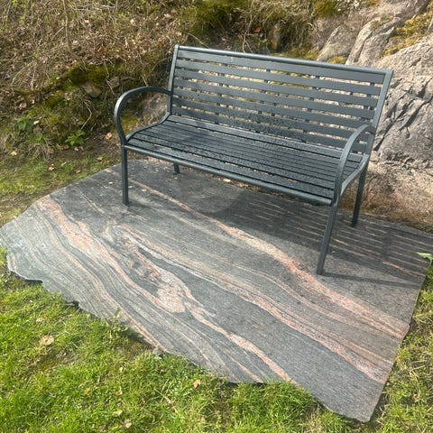 Grå granittplater med glatt overflate, egnet for utendørs bruk som belegningsstein eller terrassedekke / gårdsplass. Platene har en robust og slitesterk struktur som tåler vær og vind.