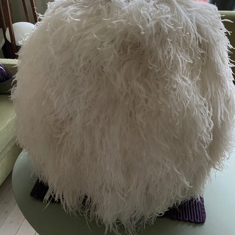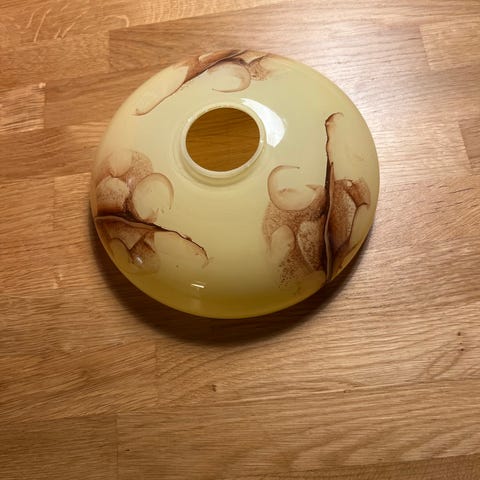 Jeg selger denne uvanlige, runde lampeskjerm. Delen i midten er pæren settes knekte av og jeg har prøvd å fikse den, men det har ikke fungert helt. Det må gjøres på nytt (kanskje noen med bedre ferdigheter enn meg kan få det til). Skjermet er ca. 35-40cm i diameter.