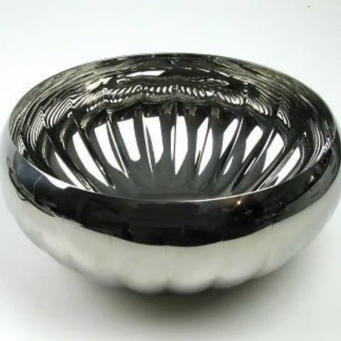 Georg Jensen skål i sølv med dekorative riller. Skålen har en blank, reflekterende overflate og et tidløst design. Egnet for servering eller som dekorasjon. Ca 16 cm i diameter og 7,5 cm høy. Må hentes.