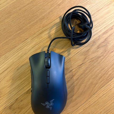 Razer DeathAdder Essential gamingmus i grå farge. Musen har optisk sensor med 6400 DPI, 5 programmerbare knapper og ergonomisk design for høyrehendte brukere.