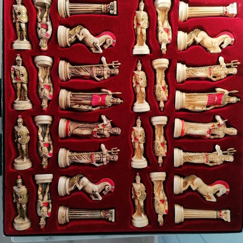 Sett med sjakkbrikker i hvit og svart farge, designet med detaljerte figurer. Fullt sjakksett uten brett.