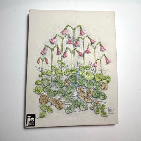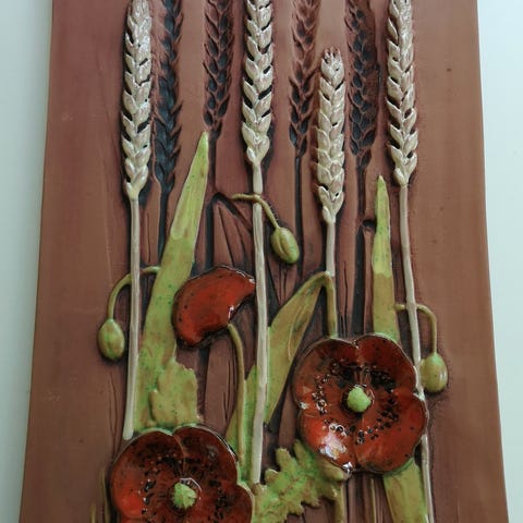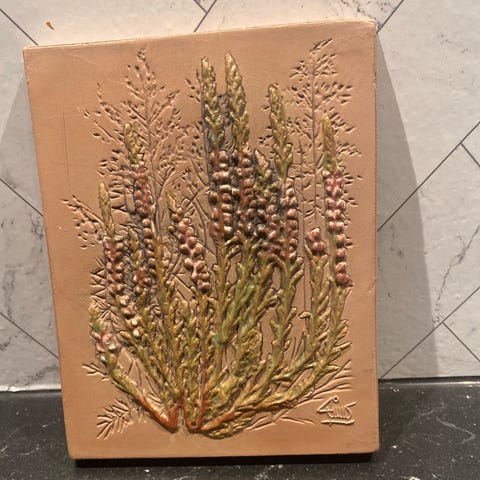 Veggplatte med engmotiv fra svenske Jie keramikk