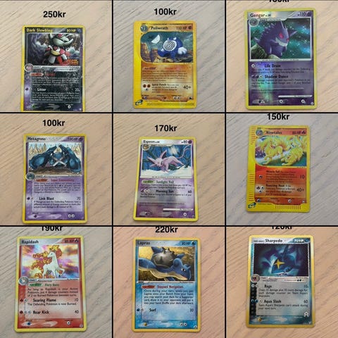 Hei, jeg selger gamle Pokemon kort fra 1999-2010 for 10kr stk. Minimum kjøp er 10 kort