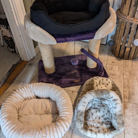 Kattestativ med beige og svart farge, består av en firkantet base, en søyle dekket med sisal, en hule nederst og to plattformer for katter å sitte eller klatre på.