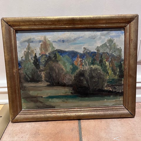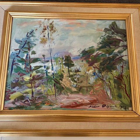 Maleri som viser et landskap med trær, busker og to personer i forgrunnen. Bildet har en ramme med dekorative elementer. Motivet inkluderer trær, åpent landskap og himmel i bakgrunnen. Ukjent kunstner, signert. Forundringspakke?