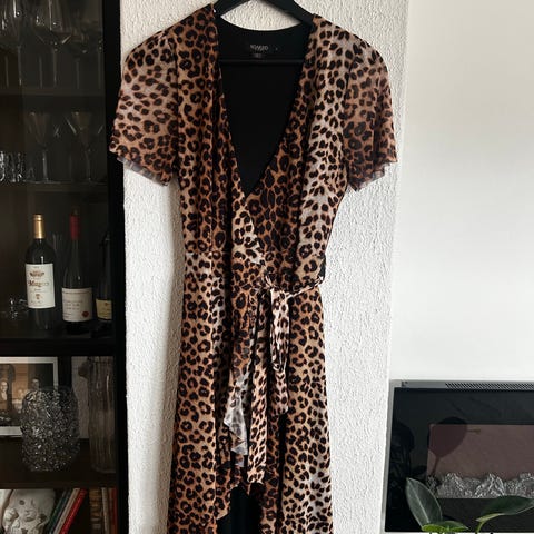 Selger en ubrukt kjole fra SOAKED in luxury med lappen på. Kjolen ble kjøpt i København / Danmark til 999 danske kr. Den er i dyreprint / leopard og er oversized, så passer fint til M og mot L.Tynt overstoff med skimmer i, svart underkjole.