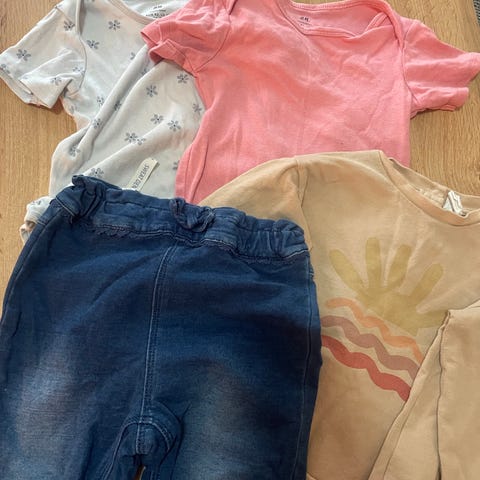 barneklær i størrelse 92 for unisex. Inkluderer flere plagg i ulike farger og mønstre, laget for barn. Plaggene består av ulike materialer egnet for barnets komfort og daglig bruk.